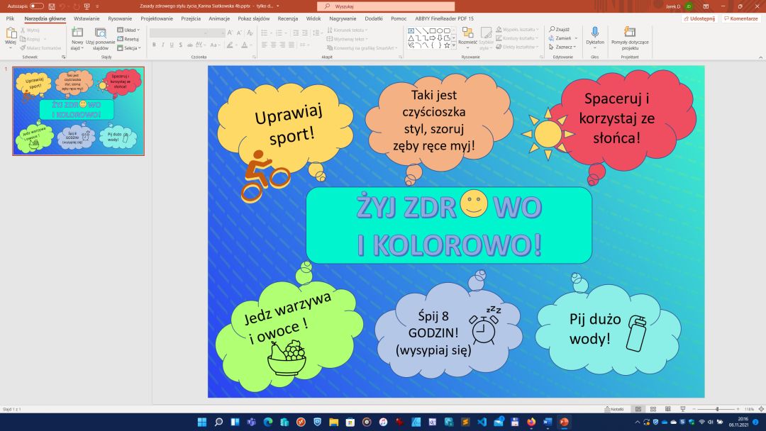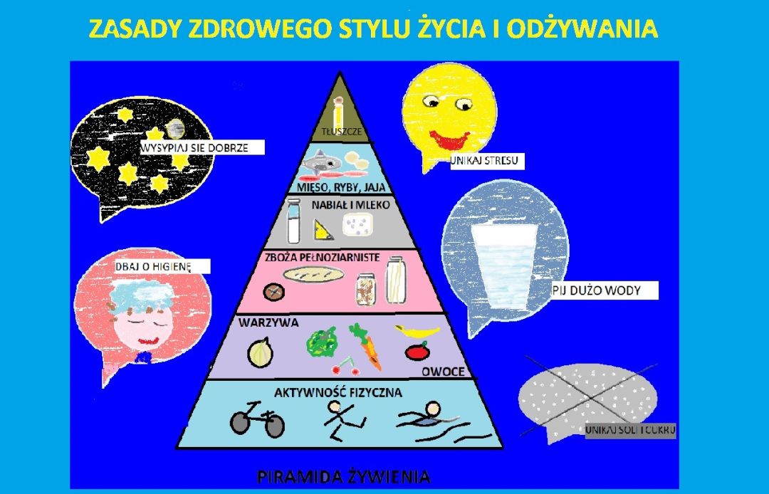 Co roku w pierwszych dniach listopada obchodzimy w szkole Dzień Zdrowego Jedzenia. Towarzyszą mu pogadanki i rozmowy klasowe o zdrowym odżywianiu oraz szkolne konkursy dla dzieci związane z tą tematyką. Cieszą się one dużym zainteresowaniem. Z przyjemnością informujemy, iż w bieżącym roku szkolnym zwycięzcami konkursu plastyczno-technicznego na najpiękniejszy witraż pt. ”Owoce i warzywa” są: I miejsce Artur W. klasa 7d, II miejsce Marcin P. klasa 7a, III miejsce Filip G klasa 4c. Wyróżnienia otrzymali Joanna Z. klasa 4b, Sebastian K. klasa 8b, Aleksandra K. klasa 6a oraz Marianna B. klasa 8c. W szkolnym konkursie komputerowym na najpiękniejszy plakat promujący zasady zdrowego odżywiania i zdrowego stylu życia zwyciężyli I miejsce Marcin P. klasa 7a, II miejsce Karina S. klasa 4b, III miejsce Karol W klasa 8a. Wyróżnienia przyznaliśmy Filipowi S. klasa 5a i Milenie P. klasa 8b. Serdecznie gratulujemy. Ze względu na obostrzenia sanitarne w tym roku prezentacja na temat zdrowego odżywiania i rozdanie nagród odbędą się na forum poszczególnych klas. Wszystkim uczniom biorącym udział w akcji serdecznie dziękujemy, a zwycięzcom gratulujemy.