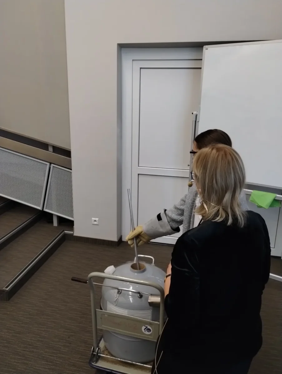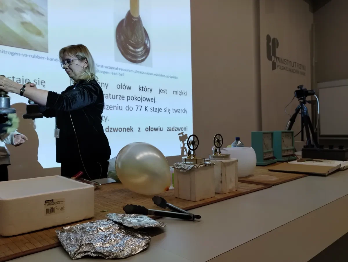 Podczas pokazu uczniowie poznali jedną z najbardziej niezwykłych i dynamicznie rozwijających się dziedzin fizyki. Prowadząca przedstawiła historię badań nad niskimi temperaturami oraz omówiła techniki umożliwiające ich uzyskiwanie, takie jak wykorzystywanie ciekłych gazów. Dzięki tym metodom naukowcy mogą obserwować zupełnie nowe właściwości ciał stałych i cieczy, ujawniające się dopiero w ekstremalnie niskich temperaturach.