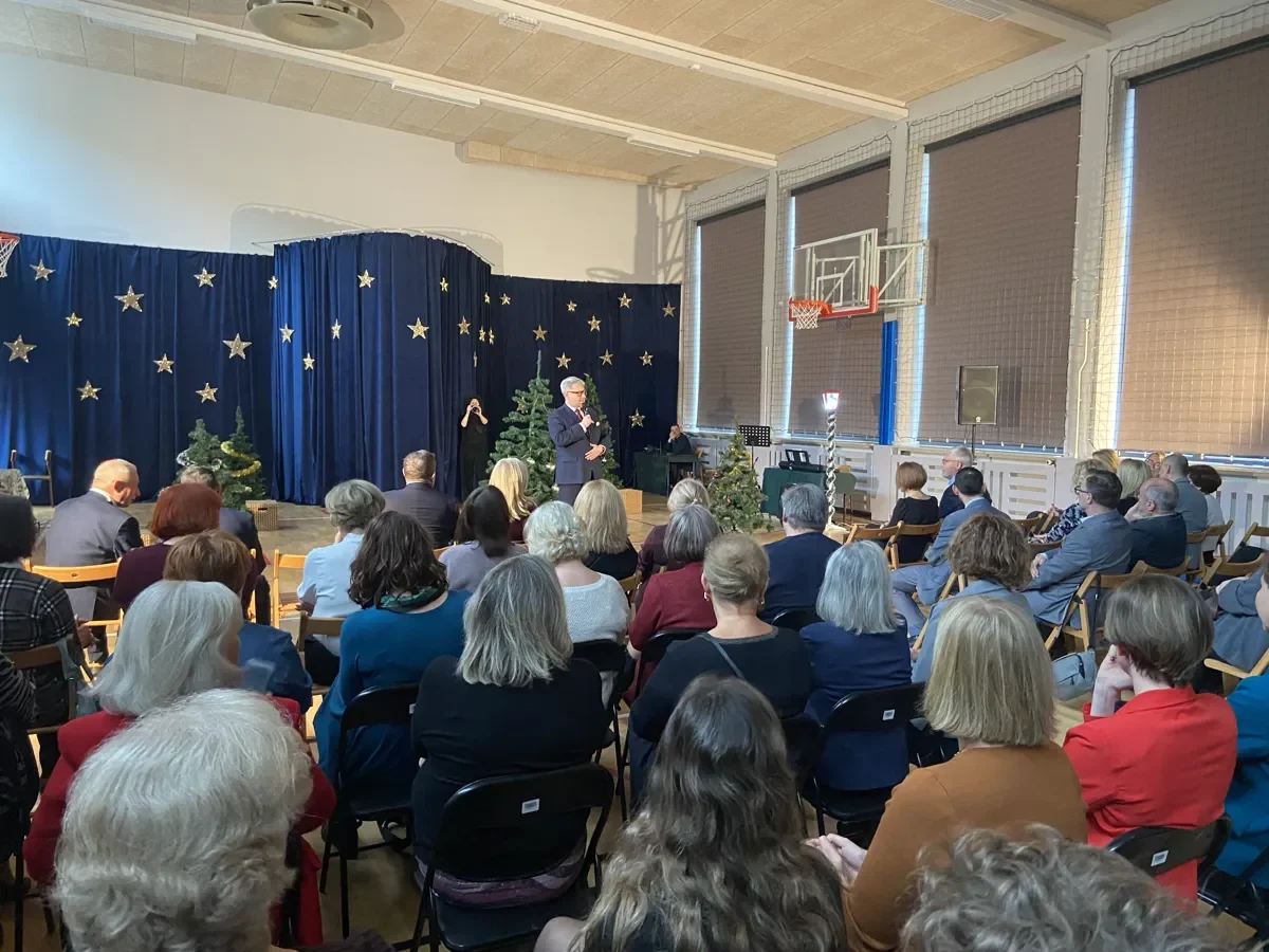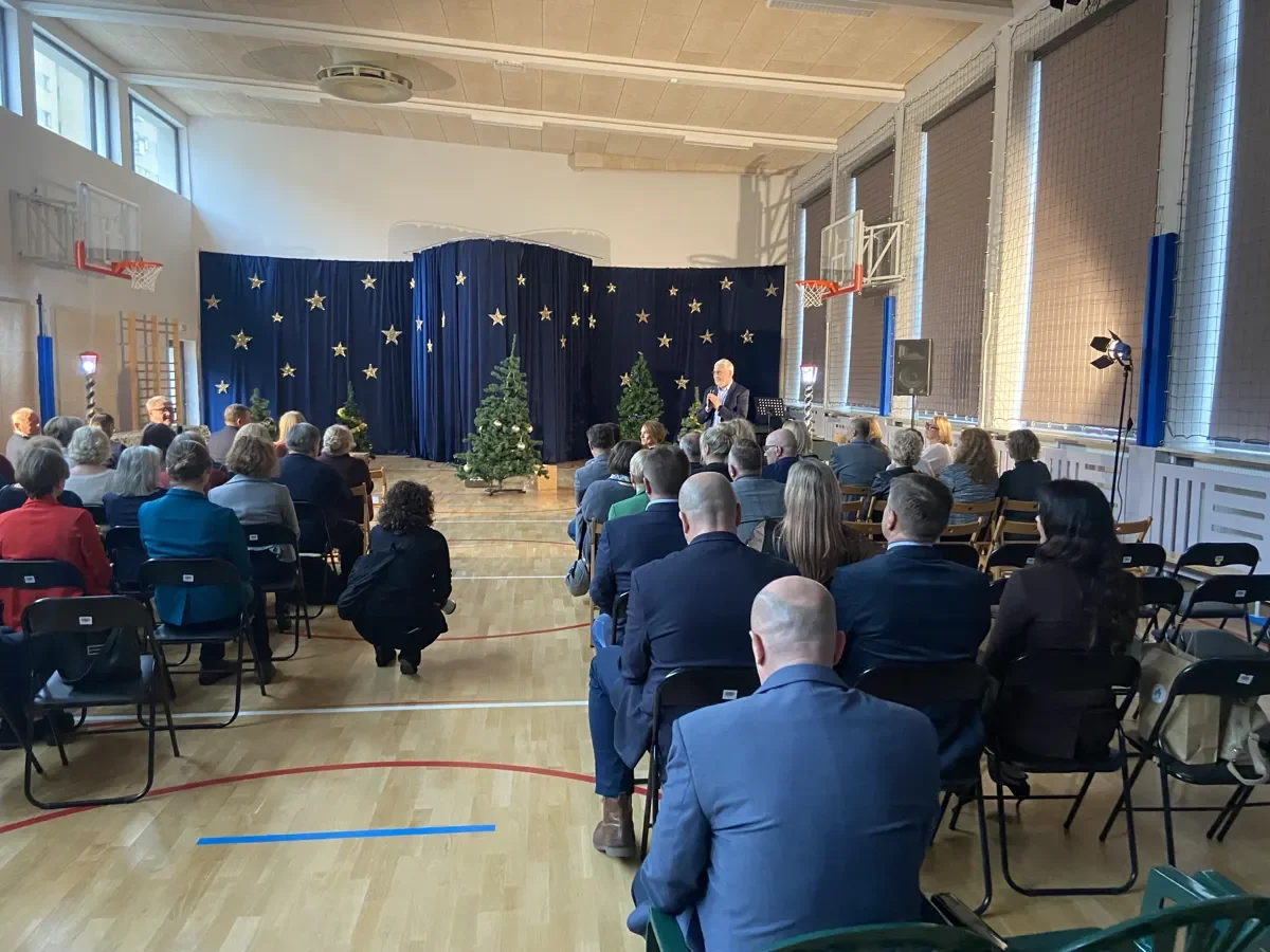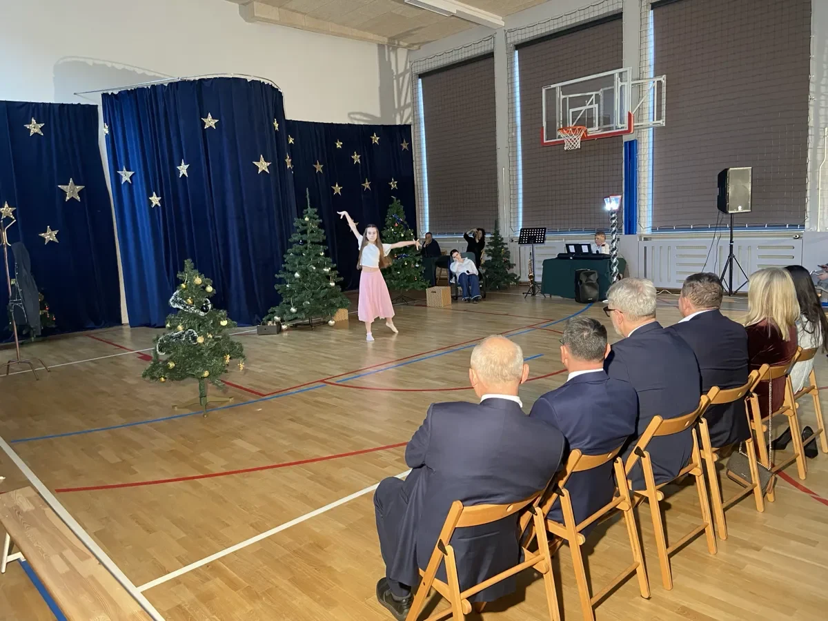 Kulminacyjnym momentem świątecznych przygotowań była wigilia dzielnicowa, która w tym roku odbyła się w murach naszej szkoły. Było to dla nas ogromne wyróżnienie. Gościliśmy wielu znamienitych gości – przedstawicieli władz lokalnych z panem burmistrzem Rafałem Miastowskim na czele, posłankę Dorotę Łobodę, radnego Jarosława Szostakowskiego, przedstawicieli związków oraz dyrektorów szkół i przedszkoli z dzielnicy Mokotów. Uroczystość rozpoczęła się serdecznym powitaniem, którego dokonała pani dyrektor Edyta Korytkowska, po czym oddała głos panu burmistrzowi. Ciepłe, pełne życzliwości i nadziei świąteczne życzenia wprowadziły wszystkich w podniosły nastrój.
