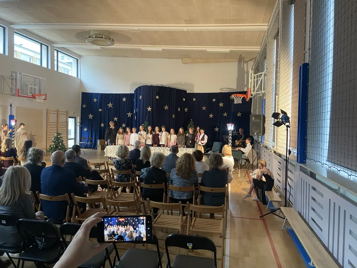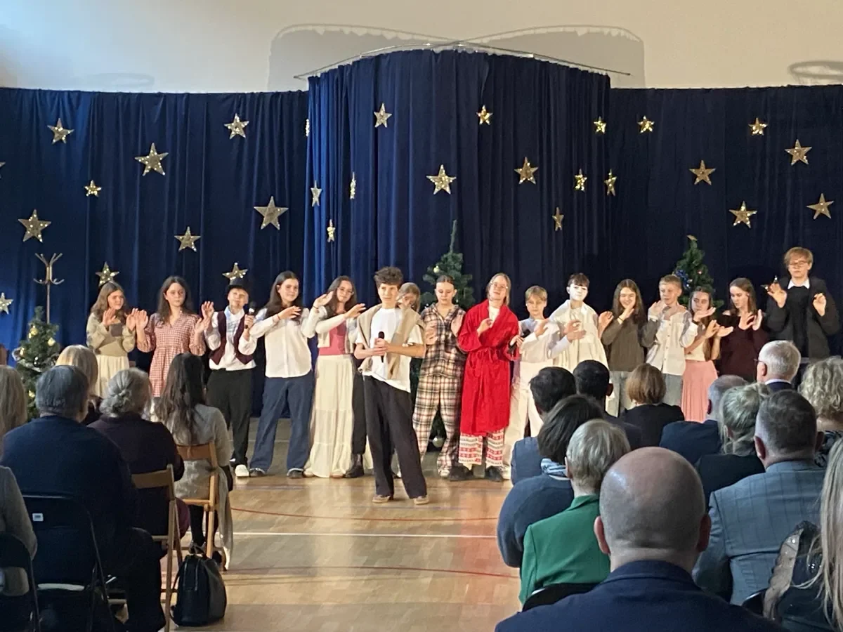 Ostatni tydzień w naszej szkole upłynął w wyjątkowo świątecznej atmosferze. Od pierwszych dni dało się wyczuć nadchodzące Boże Narodzenie – sale lekcyjne i korytarze wypełniły się kolorowymi dekoracjami, światełkami oraz własnoręcznie wykonanymi ozdobami. W tle niemal bez przerwy rozbrzmiewały kolędy i piosenki świąteczne, które wspólnie śpiewali uczniowie i nauczyciele, wprowadzając wszystkich w radosny, pełen ciepła nastrój. Równocześnie trwały intensywne próby szkolnego koła teatralnego, które z ogromnym zaangażowaniem przygotowywało się do wyjątkowego występu.