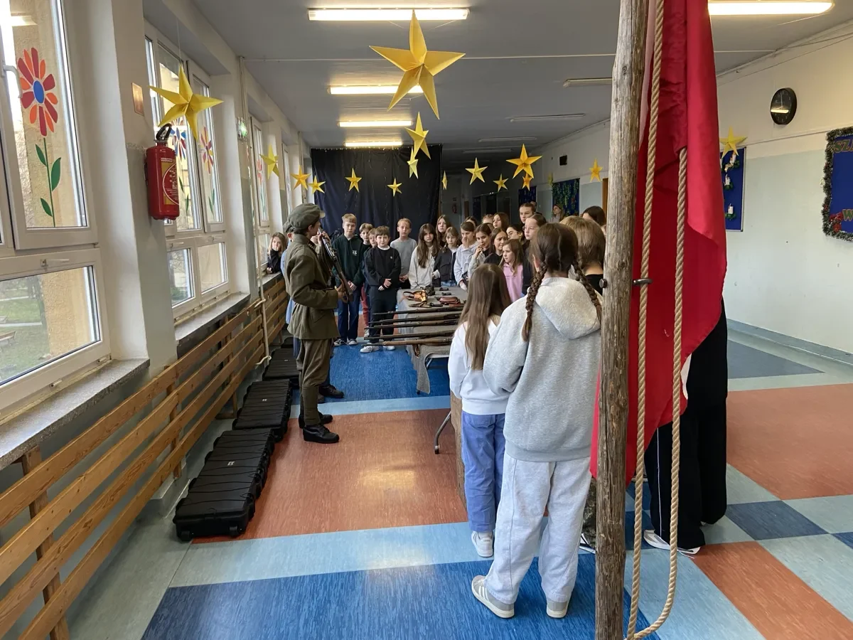 Zajęcia były nie tylko ciekawą lekcją historii, ale także doskonałą okazją do nauki poprzez doświadczenie. Uczniowie z dużym zaangażowaniem uczestniczyli w warsztatach, zadając liczne pytania i aktywnie biorąc udział w proponowanych ćwiczeniach. Spotkanie z grupą „Szare Szeregi” na długo pozostanie w ich pamięci jako żywa i inspirująca lekcja historii.