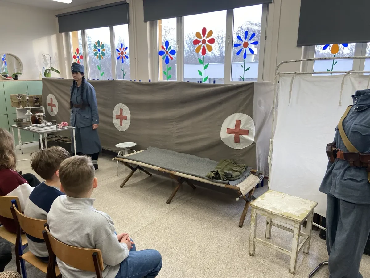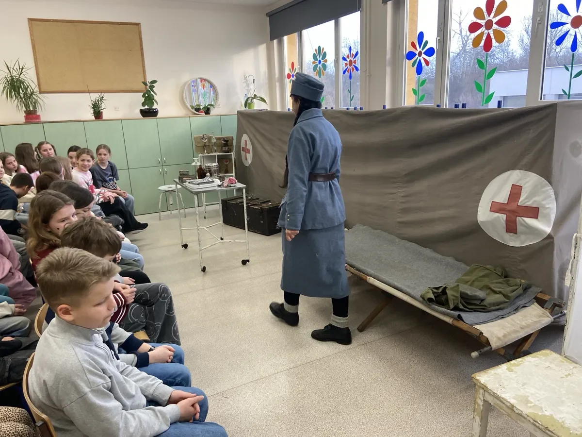 Dużym zainteresowaniem cieszyła się prezentacja uzbrojenia i wyposażenia żołnierzy z tamtego okresu, a także pokaz pracy szpitala polowego. Uczniowie mogli z bliska zobaczyć historyczne repliki karabinów, hełmów i elementów umundurowania. Największą atrakcją była możliwość aktywnego udziału w warsztatach – każdy mógł dotknąć prezentowanego sprzętu, przymierzyć hełm, a także spróbować swoich sił w opatrywaniu „rannego” żołnierza.