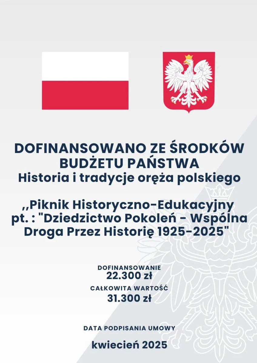 Projekt Żywych Lekcji Historii w dniu 17.12.2025 r. został zrealizowany w ramach projektu – Piknik Historyczno-Edukacyjny pt.: „Dziedzictwo Pokoleń – Wspólna Droga Przez Historię 1925-2025”, który jest współfinansowany ze Środków Budżetu Państwa z dyspozycji Ministerstwa Obrony Narodowej.